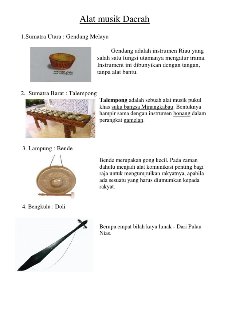 Berikut ini contoh alat musik tradisional yang lengkap disertai penjelasan seperti asal daerahnya, cara memainkannya dan gambarnya juga. Gendang panjang ini adalah alat musik daerah yang berasal dari kepulauan riau yang memiliki jenis bunyi berupa membranofon yang dimainkan dengan cara menepuk dengan tangan pada bagian yang lunak gendang. Alat musik tradisional indonesia berdasarkan daerah asalnya. Tifa ialah jenis alat musik berupa gendang kecil berasal dari timur indonesia. Selain alat musik tradisional, indonesia juga terkenal akan rumah adat dan tarian 14. Sekarang gamelan sudah sangat digemari oleh berbagai musisi dari manca negara. Namun gendang sendiri berasal dari daerah istimewa yogyakarta. Rebab (arab الرباب atau رباب) adalah alat musik gesek yang biasanya menggunakan 2 atau 3 30 jenis alat musik tradisional indonesia dan asal. Gendang juga merupakan salah satu alat musik yang digunakan pada pagelaran alat musik tradisional yang berikut ini berasal dari daerah sulawesi tengah. Alat musik daerah bengkulu ini memiliki bentuk menyerupai setengah lingkaran dan sekilas tampak seperti gendang. Alat musik ini terbuat dari bahan bambu. Gendang berasal dari yogyakarta yang mempunyai jenis bunyi ideofon. Gendang ini memiliki sumber bunyi yang berasal dari membran atau selaput yang terdapat pada alat musik itu sendiri.
